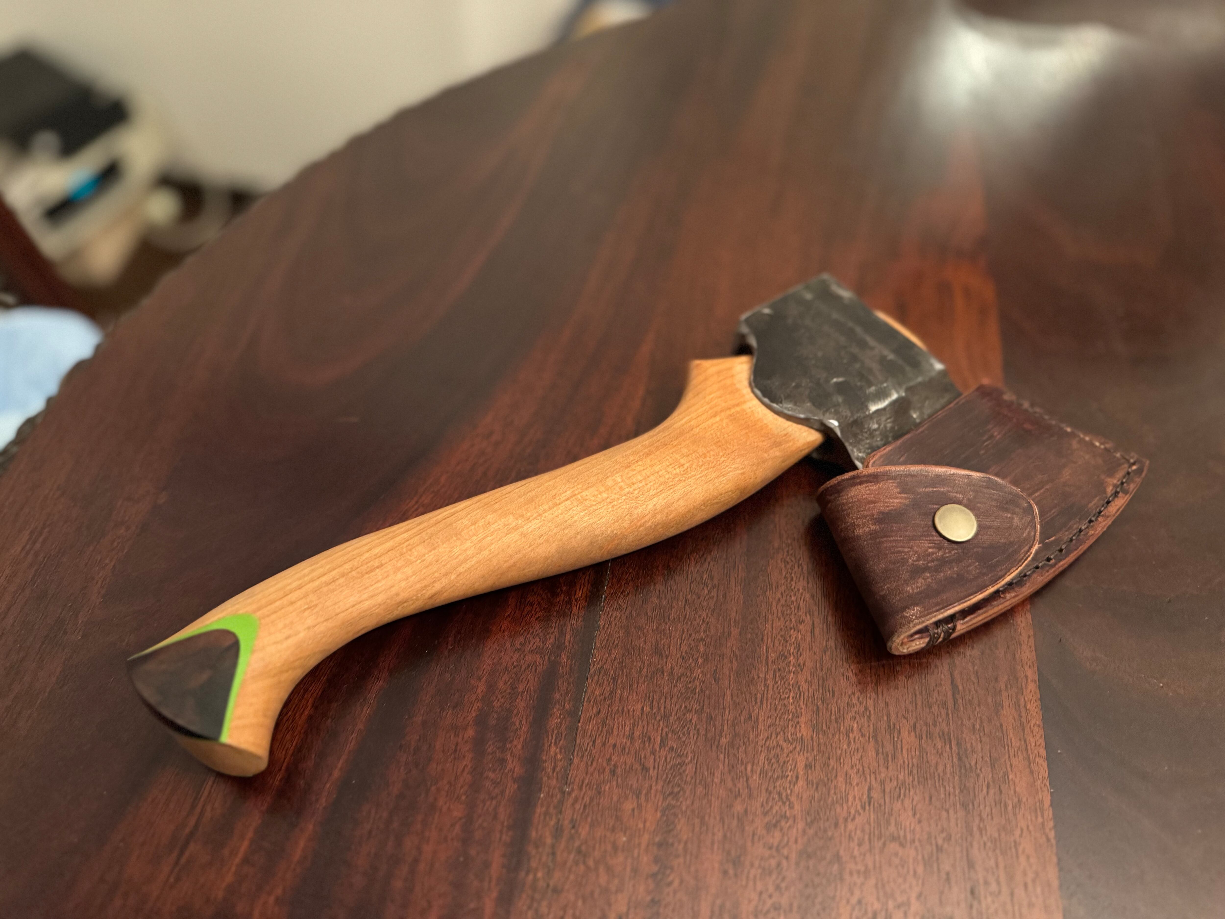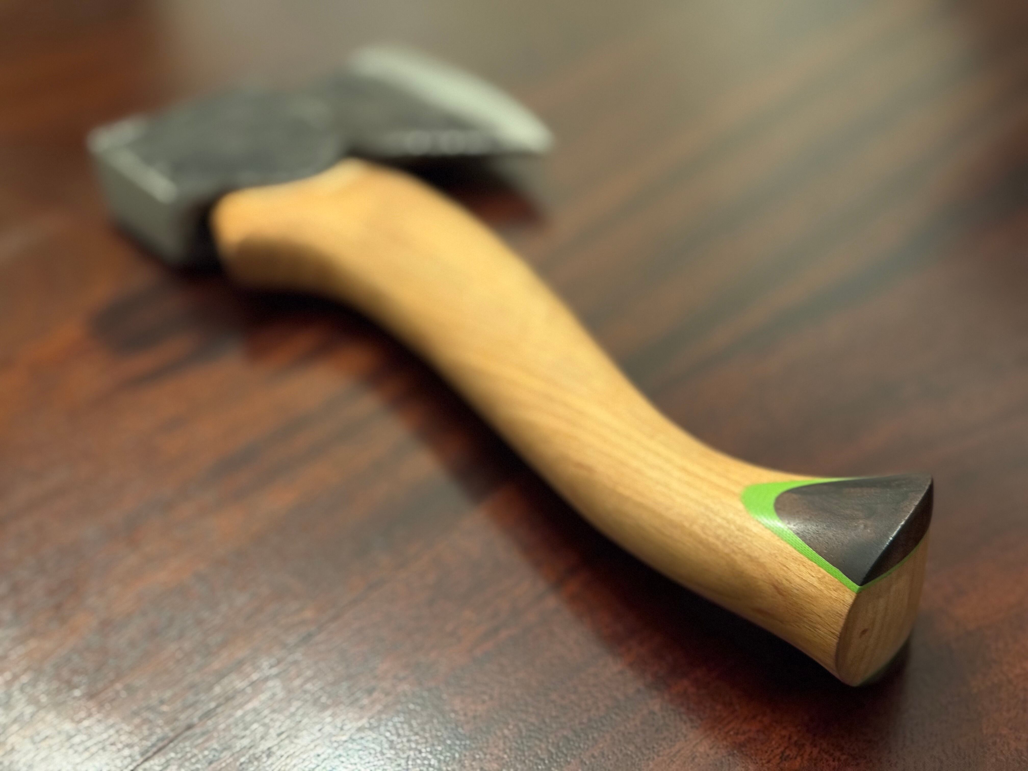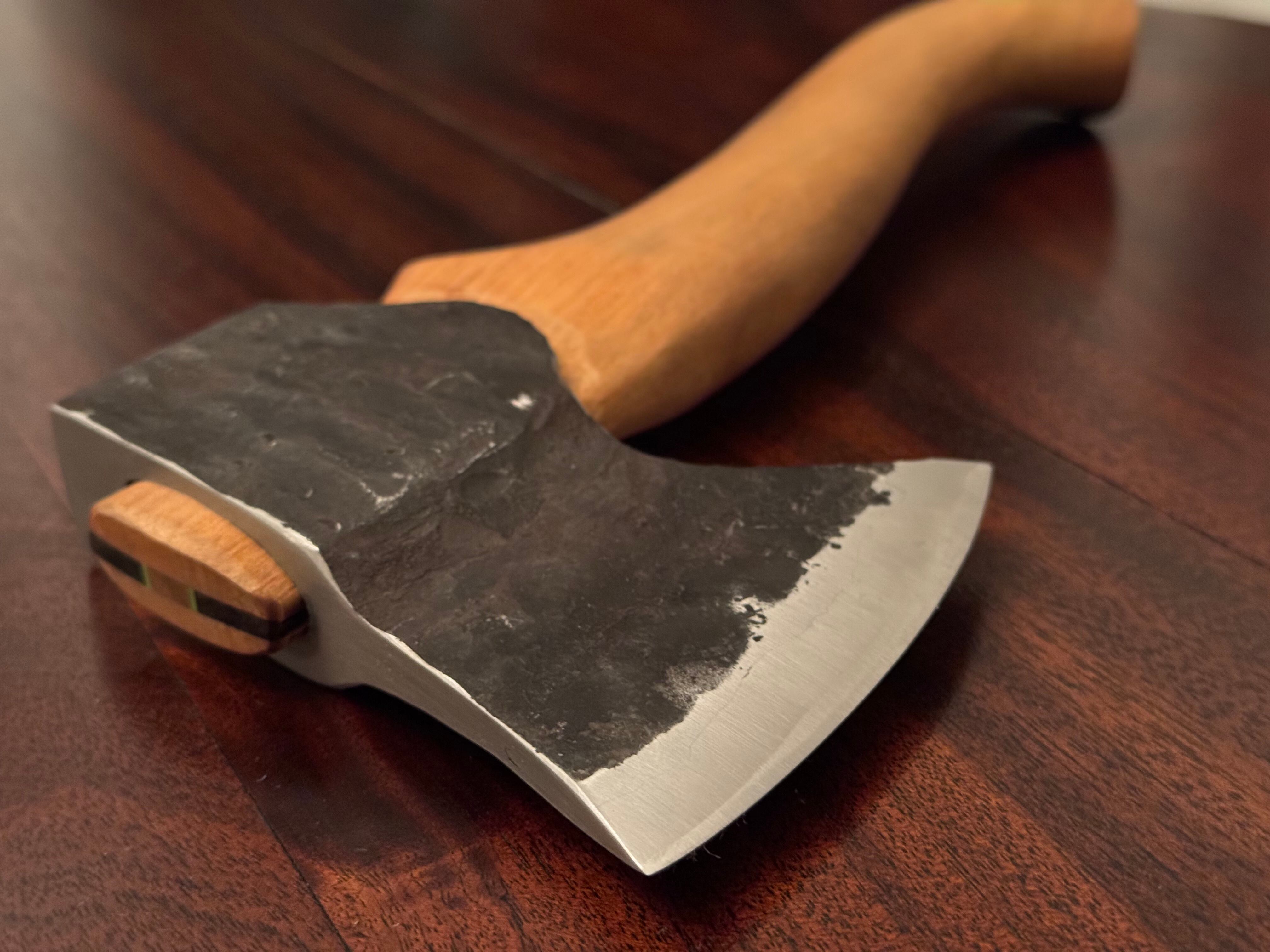 刃部に炭素鋼を割り込みで仕込んだヘッドを鍛造で仕上げた、ブッシュクラフト向けのハンドメイドアックス。切れ味と粘りを両立した構造に、取り回しの良さを重視したサイズ感で、フィールドでの実用を第一に設計しています。