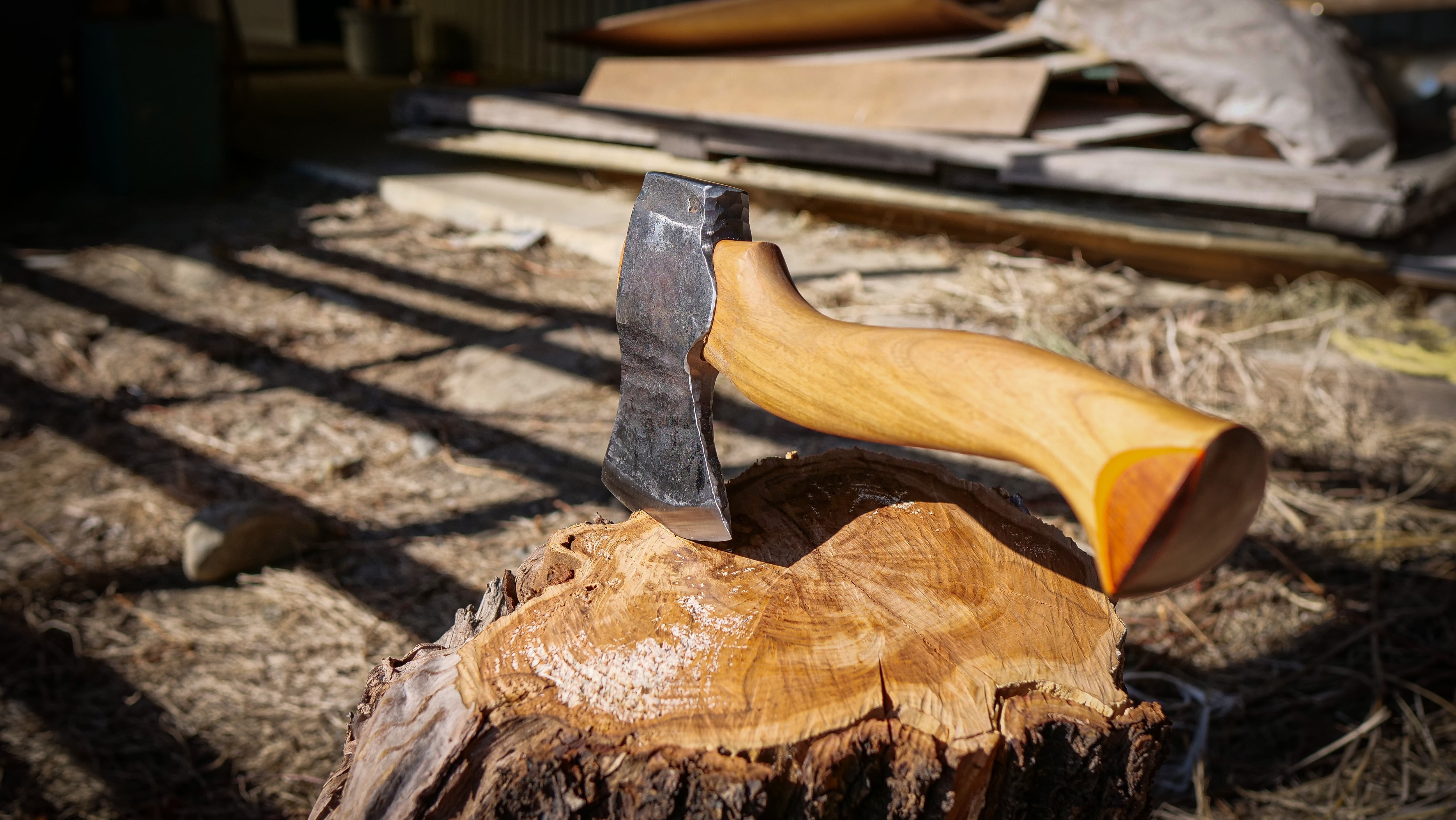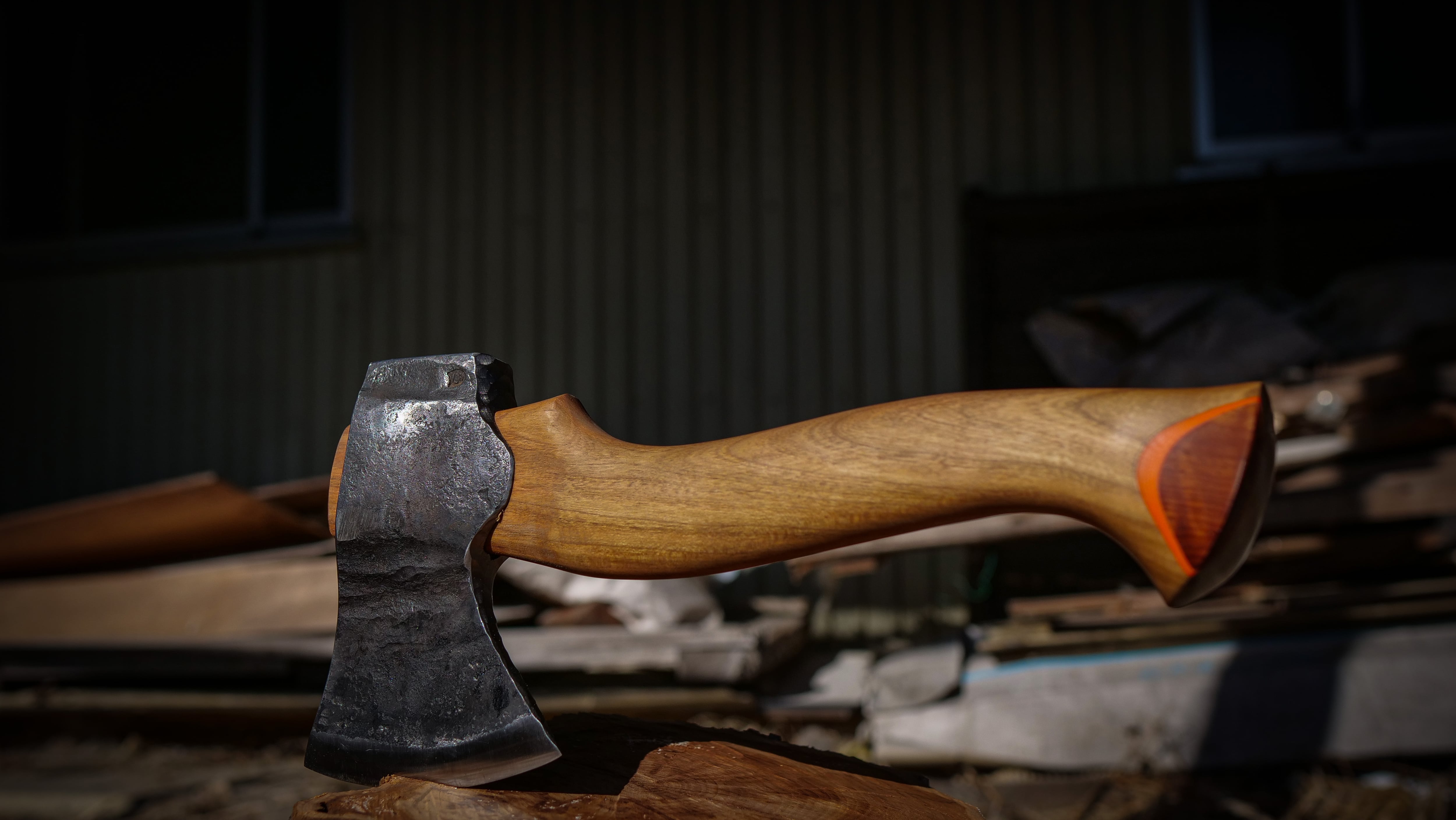 刃部に炭素鋼を割り込みで仕込んだヘッドを鍛造で仕上げた、ブッシュクラフト向けのハンドメイドアックス。切れ味と粘りを両立した構造に、取り回しの良さを重視したサイズ感で、フィールドでの実用を第一に設計しています。