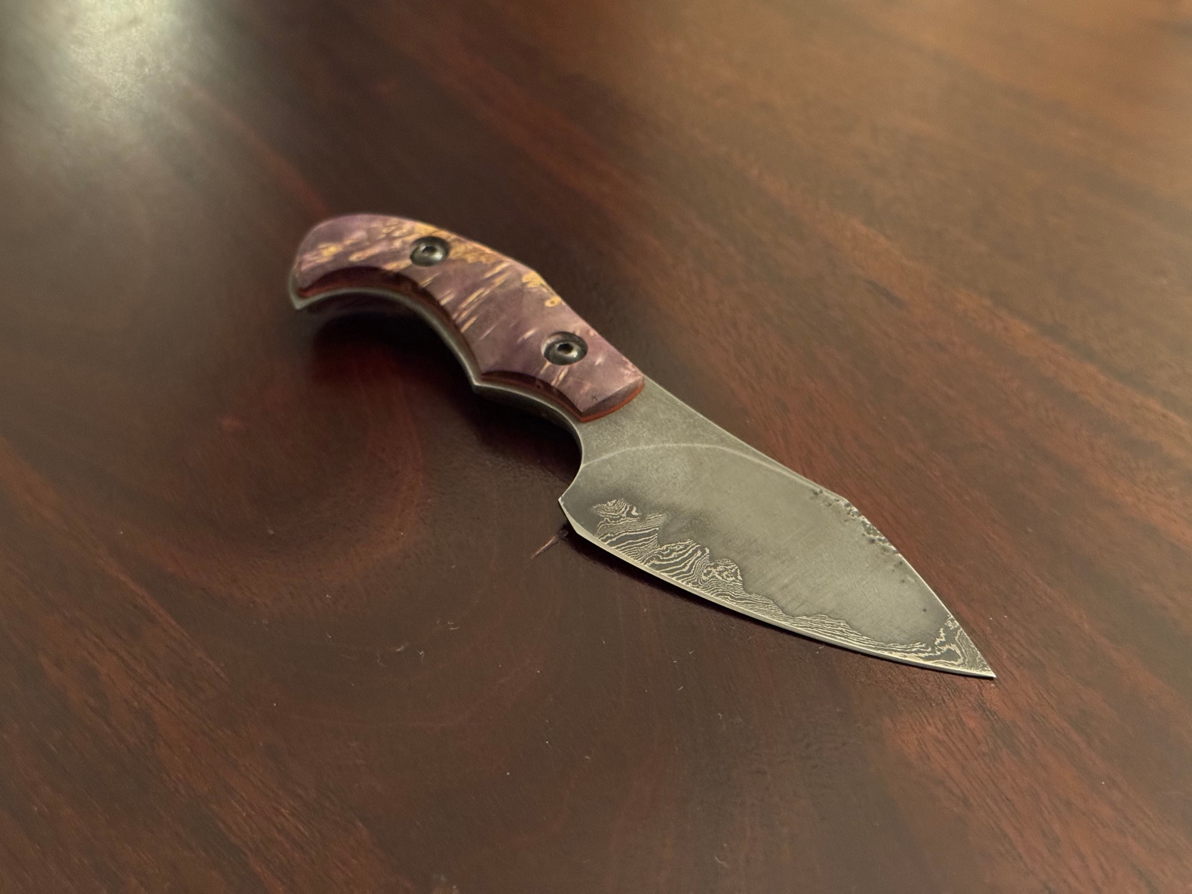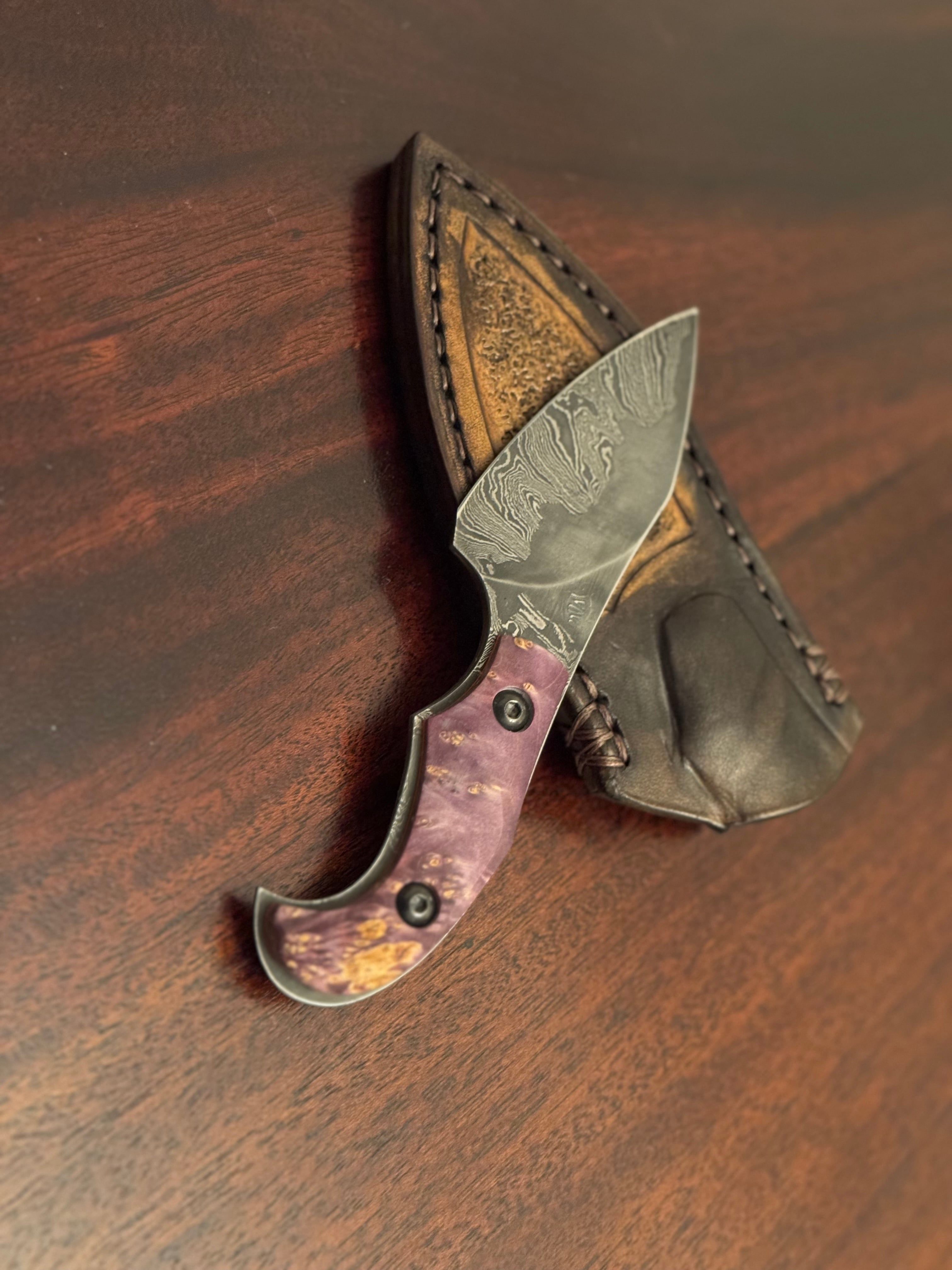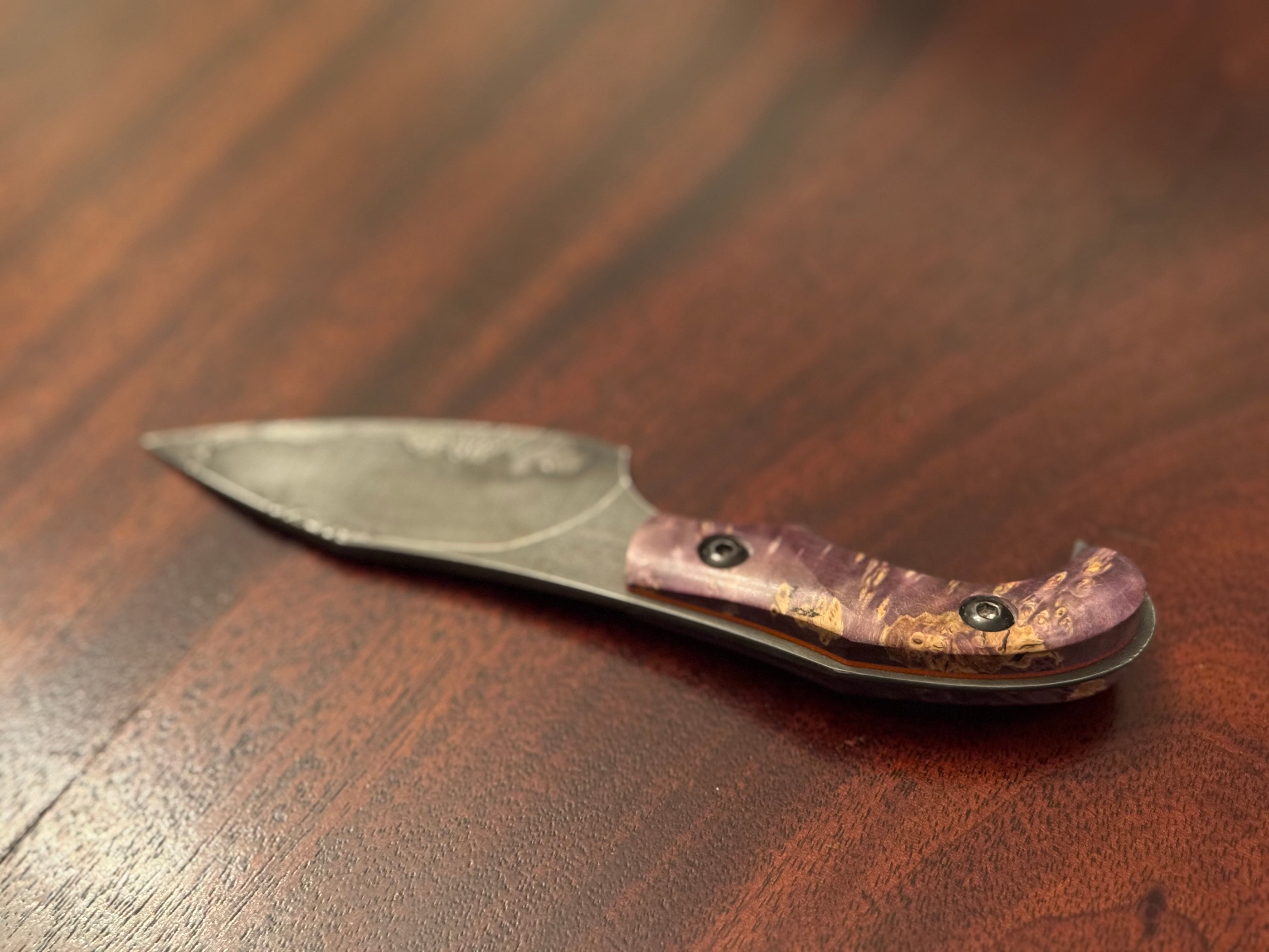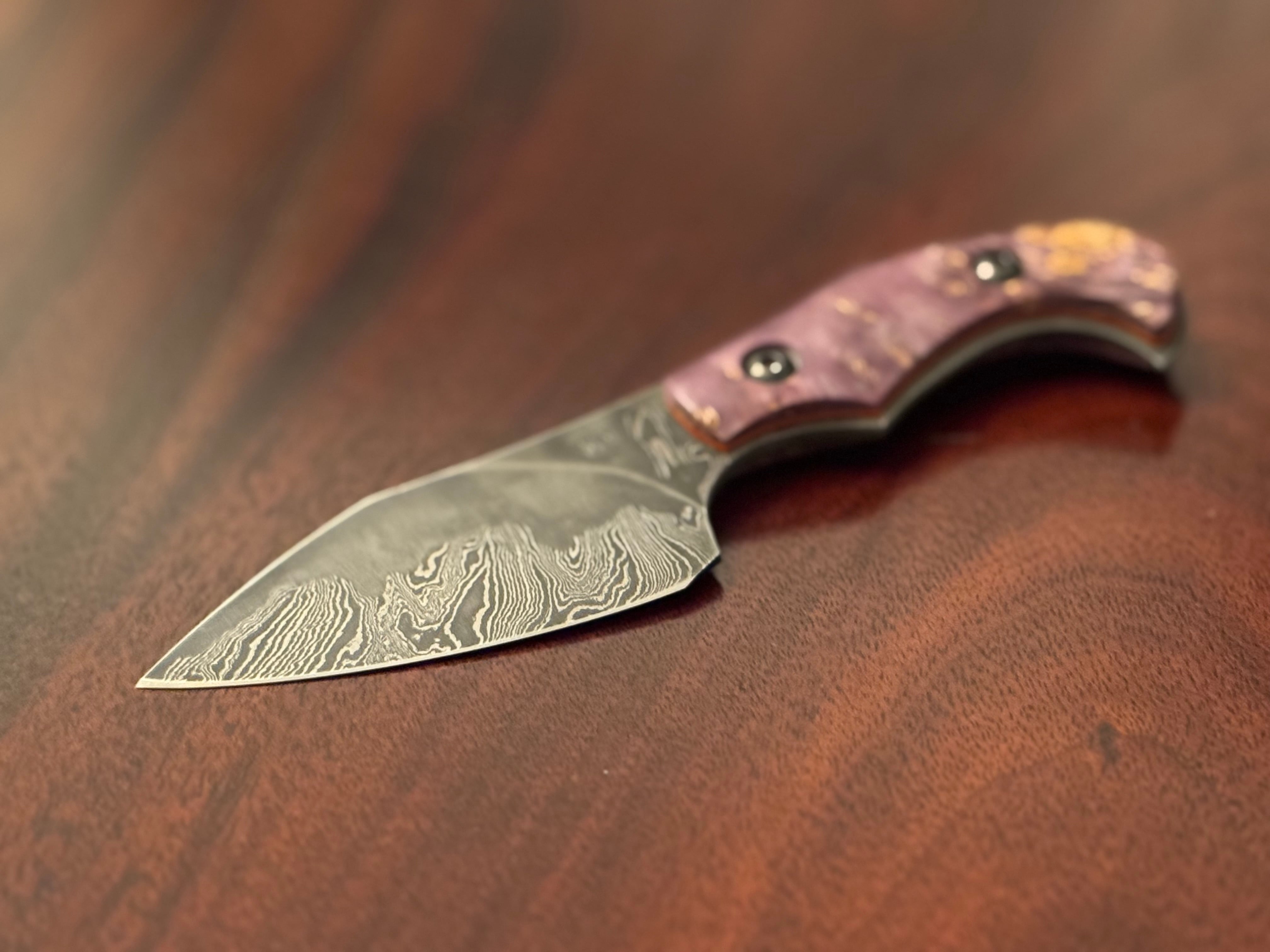 ツイストパターンのダマスカス鋼を芯材に据えた3枚構造のブレードを持つ、小型ながら存在感のあるナイフです。