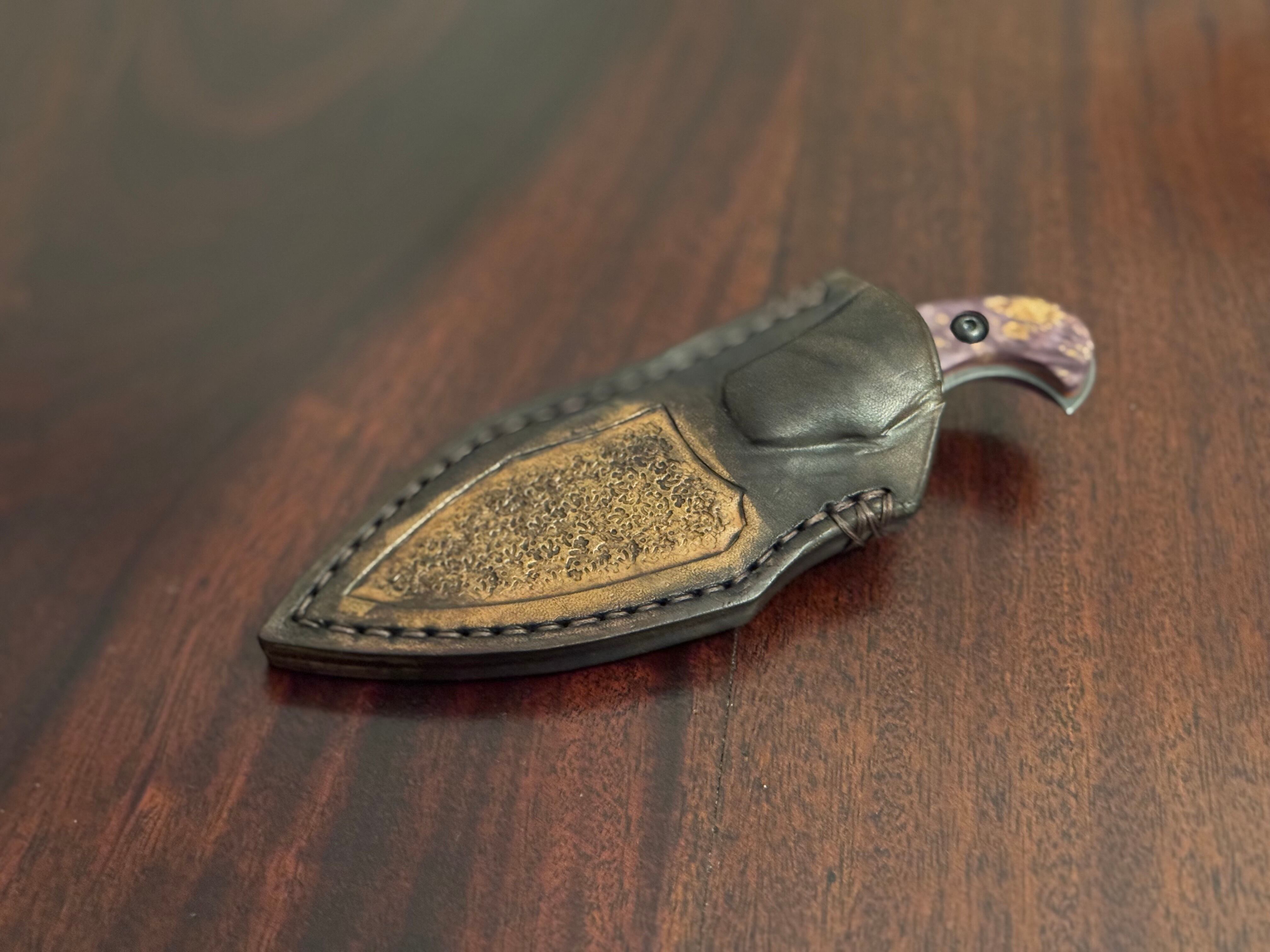 シースはレザー製。手作業によるカービングを施し、ナイフの雰囲気に合わせた一点物の表情に仕上げました。